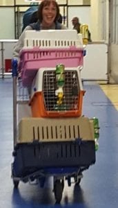 We organize all the paperwork, and bring the animal to the airport. We help the flight volunteer with the ‘check in’ process and pay any travel fees. The animal is safe and sound in a large cage (with food and water) that travels with the luggage, so there is no burden on the flight volunteer during the trip. When arriving at the final destination, the cage is available for pick-up with the luggage and best of all, the new adopters are waiting at arrivals, often with a crowd of friends to help welcome their new family member! We’ve had 100% success with this process.